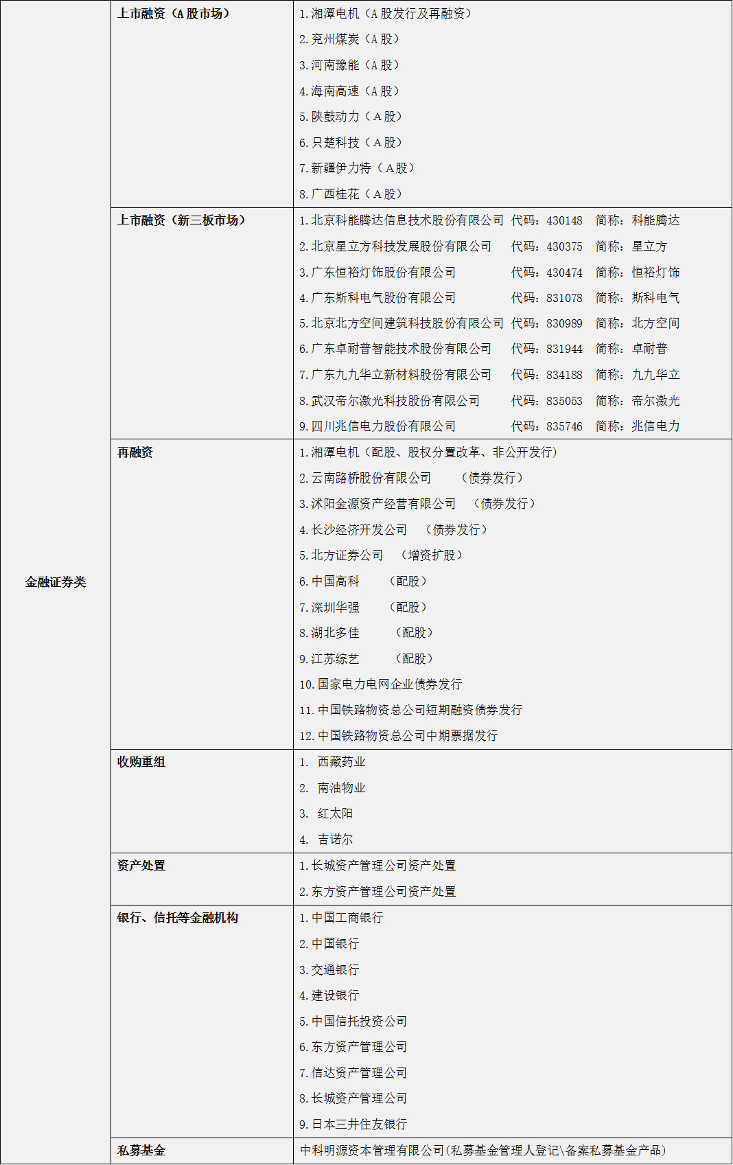 多年来,本所紧密跟随金融证券业务领域的发展脉搏,并积极前瞻金融证券业务领域的发展趋势,经过多年的稳健发展,截至目前,本所在金融证券法律服务领域积累了大量成功案例,在银行、保险、证券发行等诸多方面均有建树。在银行方面,本所与多家银行包括若干境外银行长期保持着密切的业务合作关系,从银行日常经营业务到其内部管理机制,本所依银行方面的委托就中国法律的适用出具法律意见书,为其管理层的决策提供法律意见;在证券发行方面,包括股票、企业债券、中期票据、短期融资券等,本所先后为多家企业的证券发行担任专项法律顾问,就其证券的发行进行核查、验证并出具法律意见书,确保发行人的合格证券产品合法、合规进入证券市场;在保险领域,本所为多家保险公司提供长期或专项法律服务,除日常经营事务外,还就保险公司的产品方案、保险资金投资等事项出具法律意见书,为保险产品在保险行业主管部门的批准、备案提供其合法性、合规性的法律意见。在上述法律服务业务中,本所律师率先在核准制度下为湖南省第一家股票发行上市提供了法律服务,在《保险资金间接投资基础设施项目试点管理办法》出台后,本所律师为保险资产管理公司当时投资规模最大的单一基础设施投资金融产品提供了法律服务,依中国证监会的委托,本所承接了证券公司的行政清算业务,并在《中华人民共和国企业破产法》生效后,本所律师再度率先开始了金融机构破产清算业务的实践经验积累。